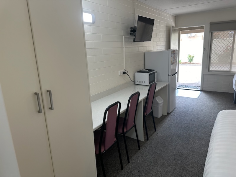 Indulge in a comfortable Queen room luxurious 26 sqm space which offers Queen Size Bed, 2-seater lounge and dining table. Flatscreen Smart TV to stream your favourite streaming platform. Amenities include: Tea, Coffee, Hot Chocolate, Sugar, Milk. Toiletries, Hairdryer, Alarm Clock, Microwave full size fridge, Apple Phone Charging station, and WIFI.