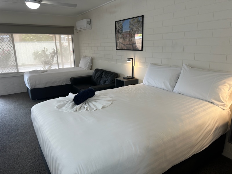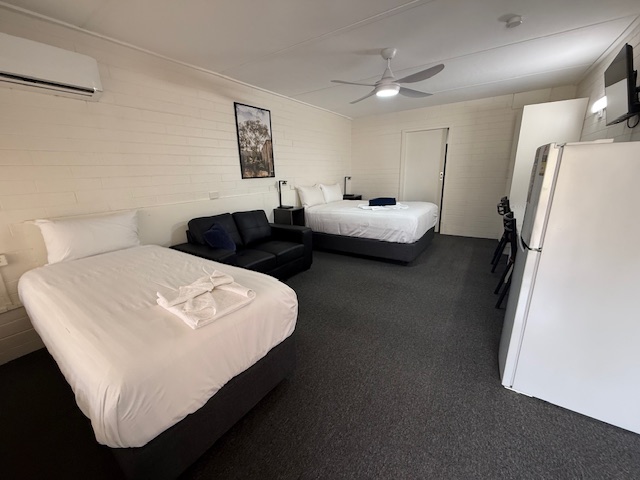 Indulge in our comfortable Twin room luxurious 26 sqm space which offers a single bed and Queen Size Bed, 2-seater lounge. Flatscreen Smart TV to stream your favourite streaming platform. Amenities include: Tea, Coffee, Hot Chocolate, Sugar, Milk. Toiletries, Hairdryer, Alarm Clock, Microwave full size fridge, Apple Phone Charging station, and WIFI.